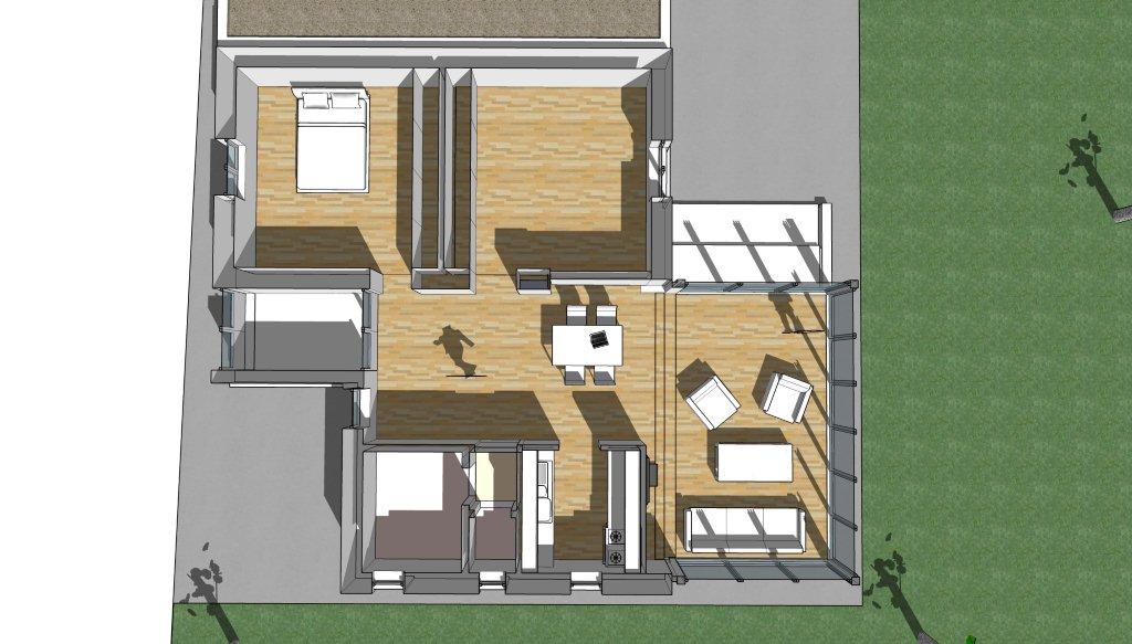 Ideja da u toku cele godine porodica ima integrisan dnevni boravak sa sopstvenim dvorištem. Sve promene vremena i godišnja doba na ovakav način su sastavni deo atmosfere dnevnog boravka. Ostvaren je vizuelni kontakt i pregled kuće otvaranjem ka dvorištu, maloj privatnoj oazi.